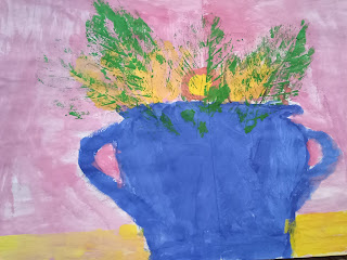 Учні та учениці 3-го класу поєднали техніки монотипії та друку листям (квітами) і створили натюрморт.